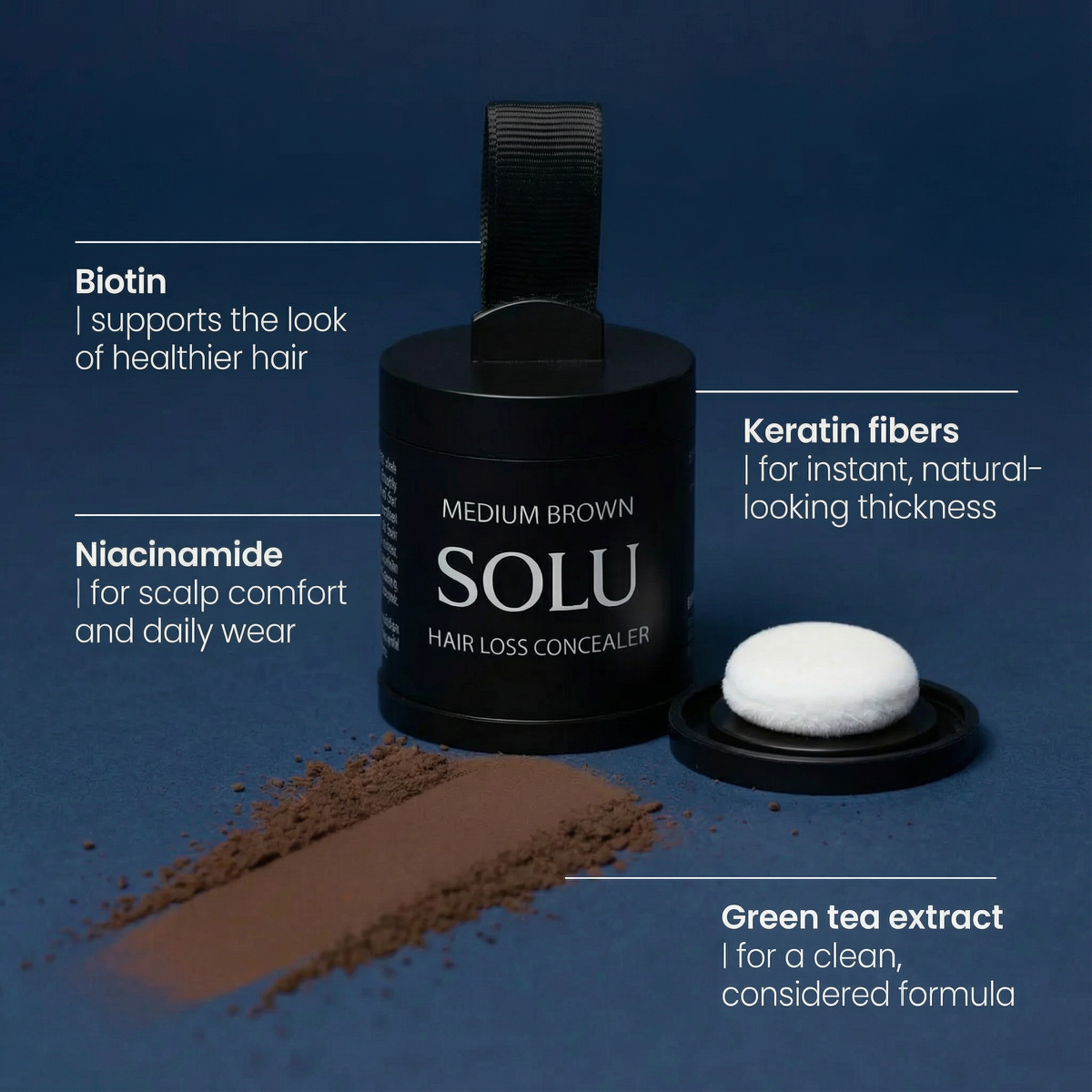 SOLU Hair Loss Concealer blends seamlessly into your hair and scalp to create the appearance of fuller hair and even color, without stiffness, shine, or mess.